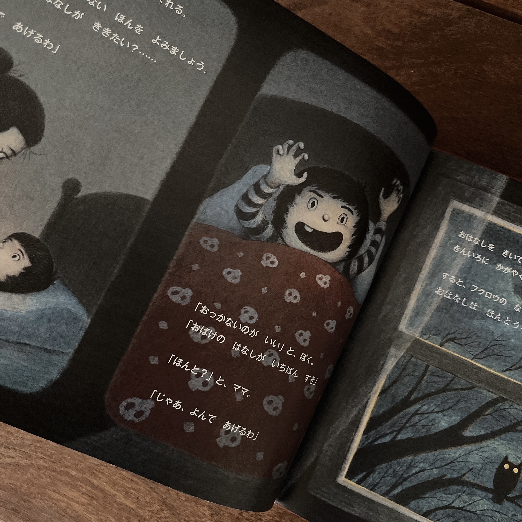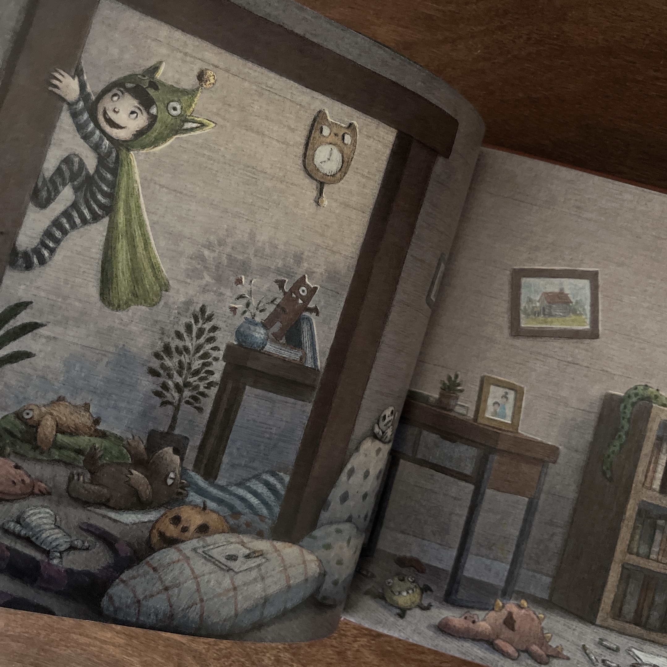 畫面感非常像奇幻電影!描述午夜時分,一群怪物聚集在一起聽故事。色調雖然神祕深沈,但怪物的表情卻很溫柔,完美營造出那種只有在夜裡才發生的魔法感。