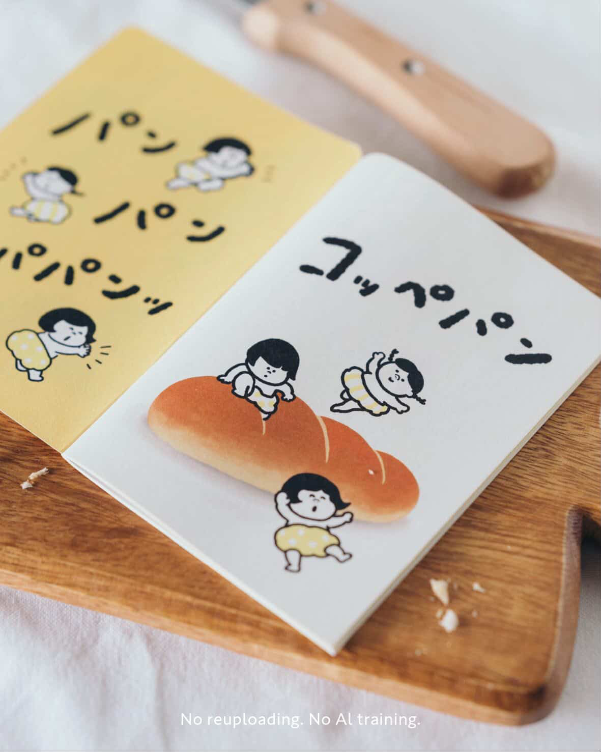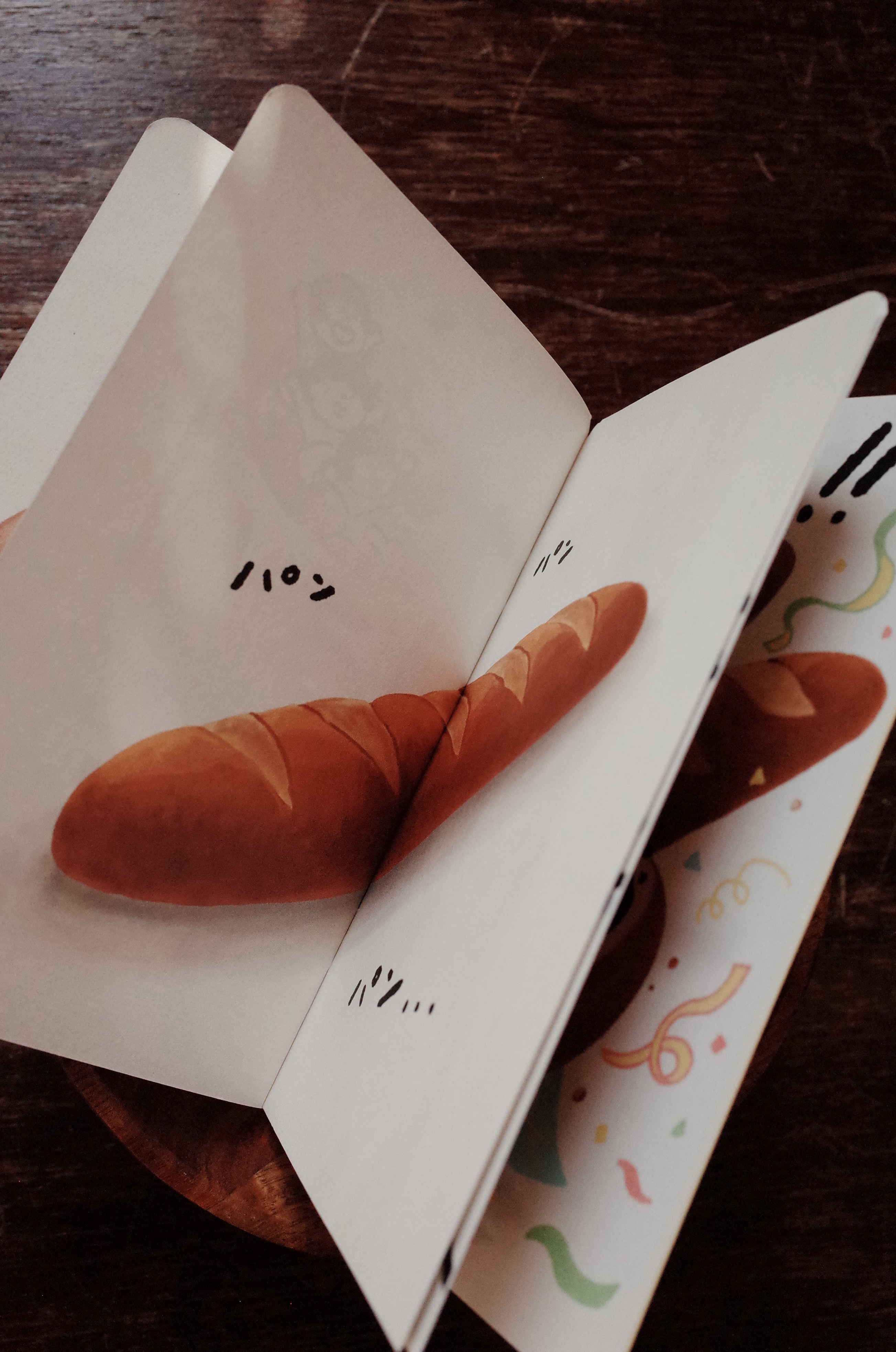 因此,我也把書套設計成像麵包袋的樣子。希望讀者在把書從書套中拿出來、再放回去的時候,不只是閱讀故事,也能透過觸摸與動作,彷彿親自體驗一次「在麵包裡」的感覺。“
